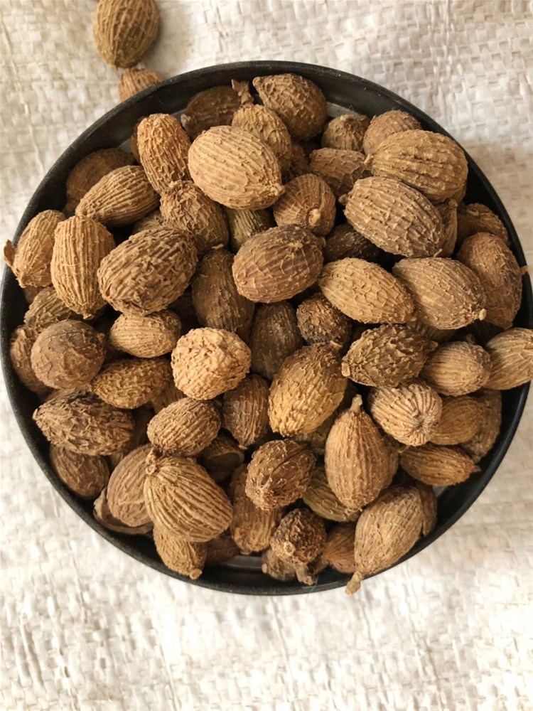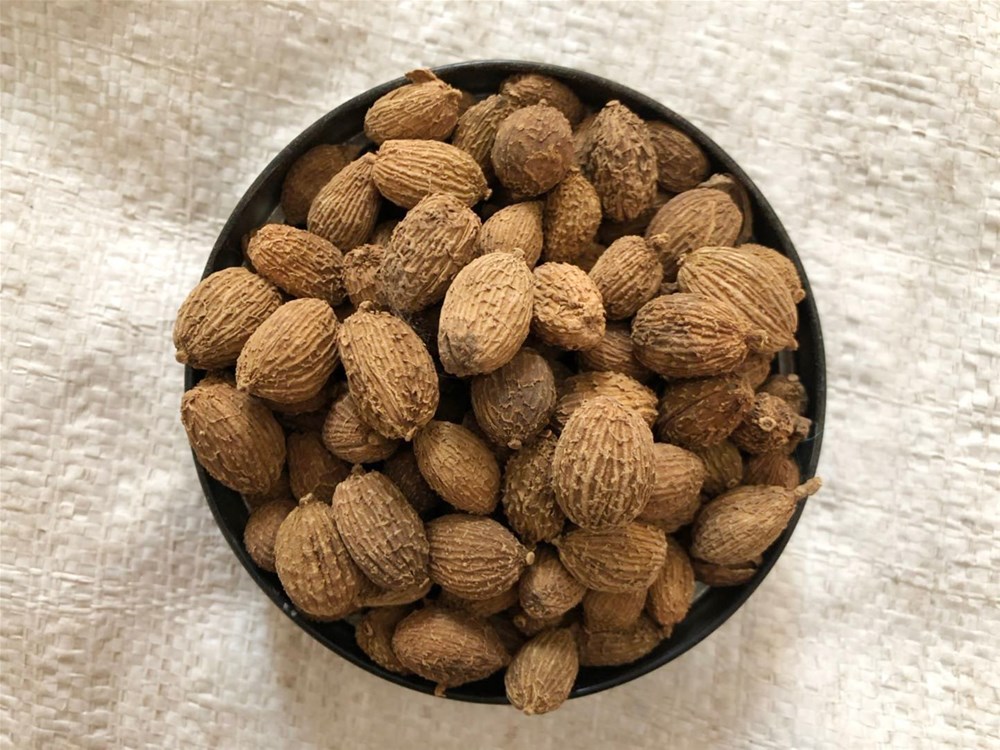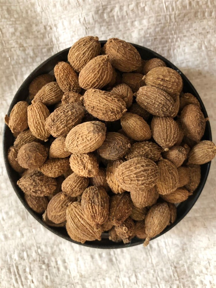 【药材性状】:呈椭圆形或卵圆形,有不明显的三棱,长1.5~2cm,直径1~1.5cm。表面棕褐色,密生刺状突起,顶端有花被残基,基部常有果梗。果皮薄而软。种子结集成团,具三钝棱,中有白色隔膜,将种子团分成3瓣,每瓣有种子5~26粒。种子为不规则多面体,直径2~3mm;表面棕红色或暗褐色,有细皱纹,外被淡棕色膜质假种皮;质硬,胚乳灰白色。气芳香而浓烈,味辛凉、微苦。