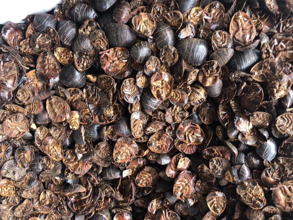【性 状】:地鳖:呈扁平卵形,长1.3~3cm,宽1.2~2.4cm。前端较窄,后端较宽,背部紫褐色,具光泽,无翅。前胸背板较发达,盖住头部, 腹背板9节,呈覆瓦状排列。腹面红棕色,头部较小,有丝状触角1对,常脱落,胸部有足3对,具细毛和刺。腹部有横环节。质松脆,易碎。气腥臭。味微咸。冀