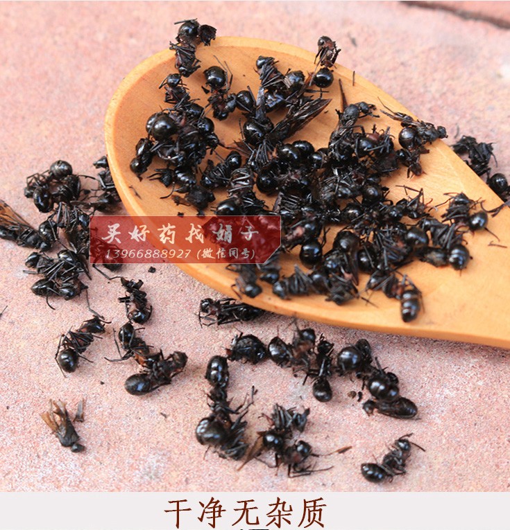 【性 状】:野生黑蚂蚁体长约5mm、酸味浓、油质多、通体漆黑油亮。头圆三角形,复眼1对,椭圆形;单眼3个,品字排列。触角1对,屈膝状,共12节,柄节最长。口器发达;咀嚼式。前胸背板甚发达,中胸背板较小。无翅。足3对,发育相等。胸部和腹部相接处缩小呈细柄状,并具有向上的鳞片1枚;腹部5节。 黑蚂蚁学名叫拟黑多刺蚁、鼎突多刺蚁,是血肉有情之躯,目前已成为世界上有开发价值的食品之一。黑蚂蚁是优良的蚂蚁品种,古时有书记载称之为神蜉、玄驹等名。拟黑多刺蚁作为昆虫类生物,含有丰富的营养成分和活性物质。