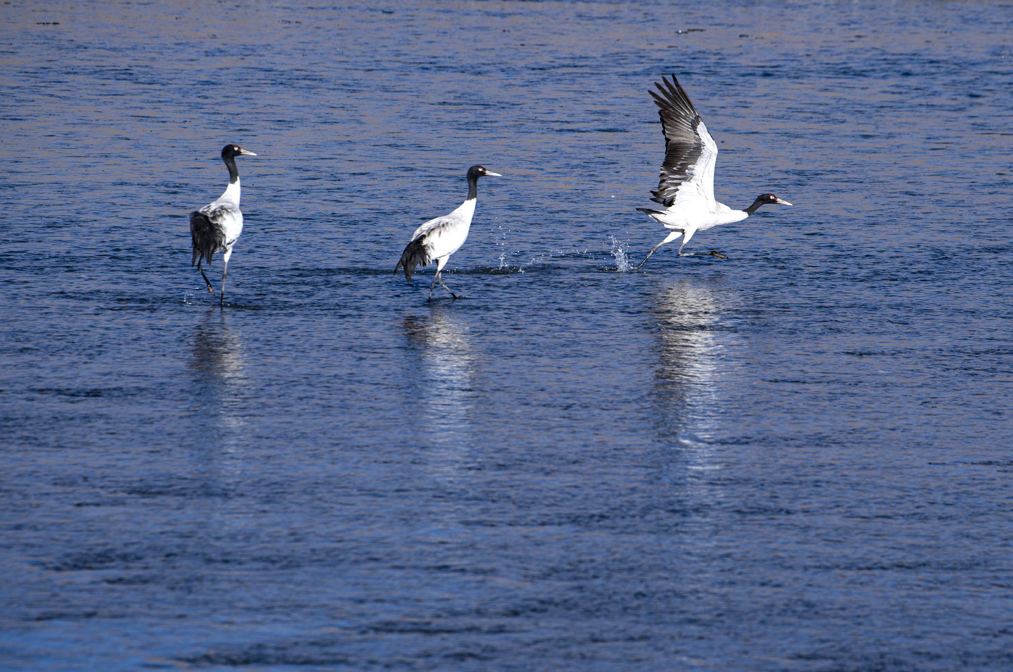 在西藏雅鲁藏布江中游河谷黑颈鹤国家级自然保护区日喀则市拉孜县越冬的黑颈鹤(1月23日摄)。新华社记者 孙非 摄