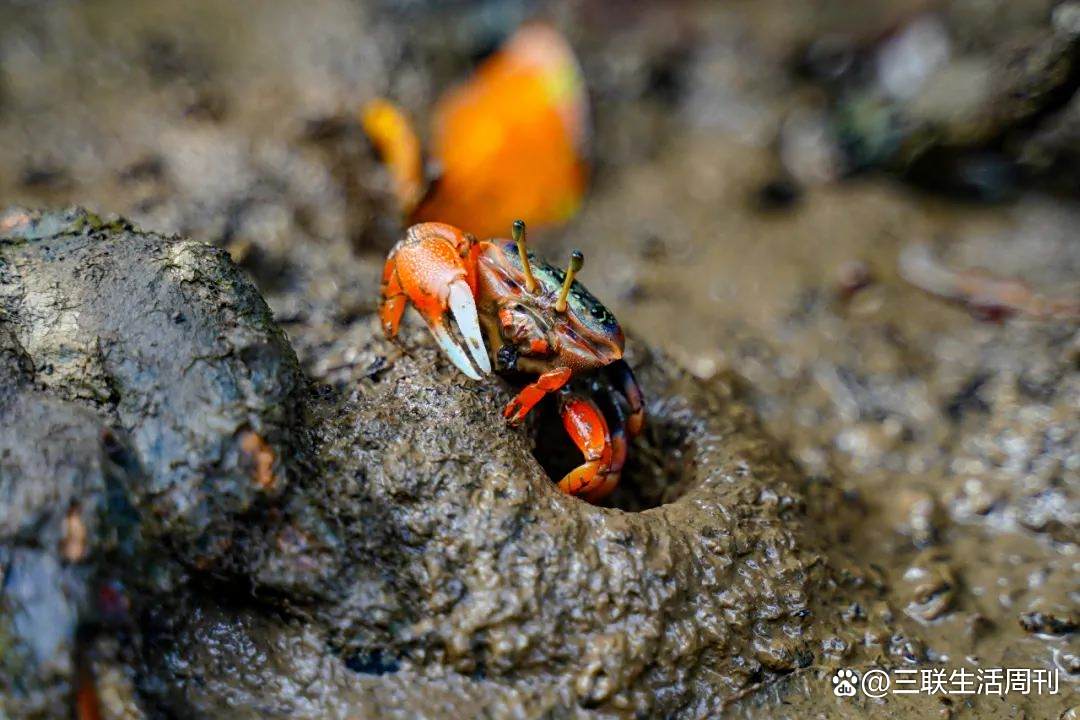 当天,我们继续深入红树林腹地,越往里走越能看到,在滩涂上散落着长短不一的绿色“种子”,而有些绿色“种子”则扎根滩涂中,长出新的芽苗来。“这是红树林的胚轴,是木榄、秋茄等红树科植物最奇妙的‘胎生’现象——种子先在果实里发育,长成棒状的胚轴,胚轴发育到一定程度后脱离母树,就会落进淤泥中。”张苇局长介绍说,有的胚轴几个小时后就能安家落户,而没能及时扎根淤泥的胚轴,会随着海浪在大海中漂浮1-2个月,等待适合自己的时机,稳稳扎根,向上生长。 在胚轴散落的附近,总可以看到密密麻麻、数不胜数的“蟹洞”,它们是身形小巧如指甲盖一样大小的招潮蟹的“家”,依托红树林庞大的生态体系,它们拥有了丰富的养料,与红树林相依相偎、共同繁衍生息;运气好的时候,还可以看到弹涂鱼在滩涂上跳跃前进的样子;而顺着繁茂的树冠向上看,天空时不时有白鹭飞过,成群结队、分外悠闲,白鹭的“邻居”勺嘴鹬、中华凤头燕鸥等300多种鸟类也会在这里过冬。据张苇局长介绍,正是因为红树林营造的良好生态气候,构成了这里丰富多样的生态环境,孕育并滋养了多种多样的物种,所以这里也被称为候鸟迁徙路上的“栖息天堂”。 在洞穴附近觅食的招潮蟹 红树林是白鹭的“栖息天堂”